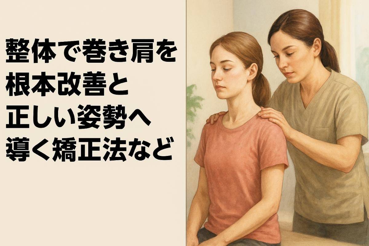整体で巻き肩を根本改善と正しい姿勢へ導く矯正法など!